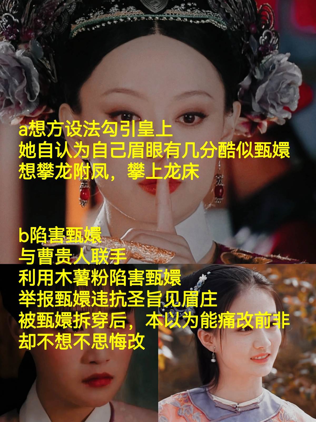 a想方設法勾引皇上‼️她自認為自己眉眼有幾分酷似甄嬛想攀龍附鳳,攀上龍床b陷害甄嬛‼️與曹貴人聯手利用木薯粉陷害甄嬛舉報甄嬛違抗圣旨見眉莊被甄嬛拆穿后,本以為能痛改前非卻不想不思悔改