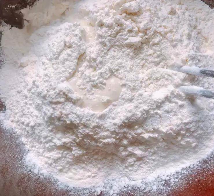 3、把面粉倒入面盆中,面水的比例一般是1:2,不過冬天比較干燥,可以稍微多加5%的水,更有利于發酵。把酵母水倒入面盆中,用筷子攪拌成面絮。