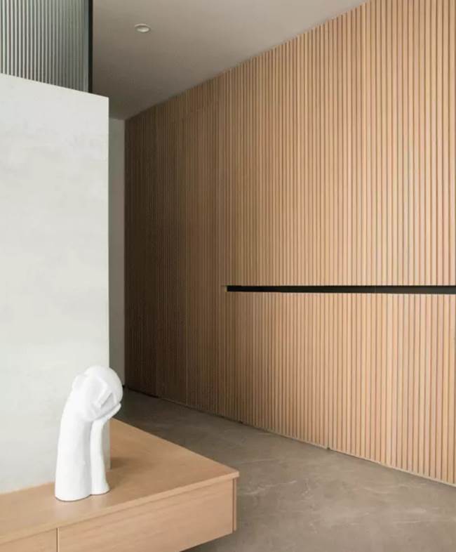 在門廊的這個區域,有一個隱藏的柜子。不僅有玄關柜子,還有衣帽間。墻上的木質設計非常簡潔大氣,也會讓上下空間更開闊。最重要的是關上門后,什麼都看不見,不容易被發現。
