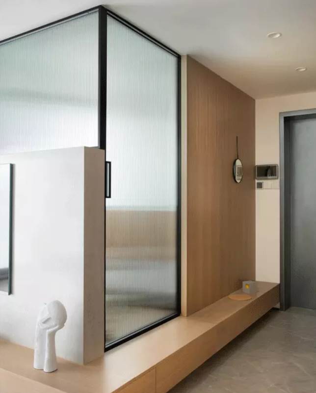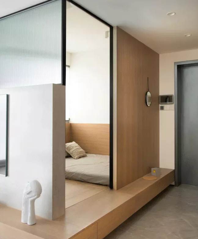 在空間的另一側設置了一個平台,也可以作為換鞋的凳子,全家人都可以坐在這里換鞋。榻榻米房間用長虹玻璃代替門窗,通透又有利于隱私。