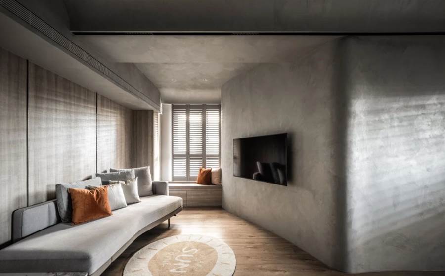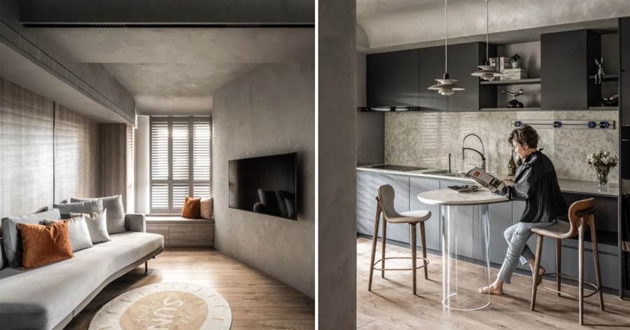 走進淺灰調性的14坪單身小宅,這是台商爸爸送給女兒的禮物,作為度假休閒的私人基地。全室跳脫傳統的居家樣貌,以開放式手法取代既有格局,並依據年輕人的喜好、個性,以自然不加修飾的「侘寂風」為基底,讓每個角落都是百拍不膩的網美牆,展現放鬆舒適的生活情境。公領域為了呈現「侘寂風」的原始美感,從天花設計到電視牆立面,以斑駁粗獷的紋理痕跡,注入巖石、水泥般的冷色調漆料,展現一抹無聲的寧靜之美,搭配暖感的深棕木地板、朦朧的間接光源,平衡視覺上的冷暖比例。針對明顯的大樑痕跡,刻意使用圓弧線條收邊,去除結構的剛硬面貌,甚至是主臥入口,也使用歐美常見的拱門造型,體現和諧對稱的美感。