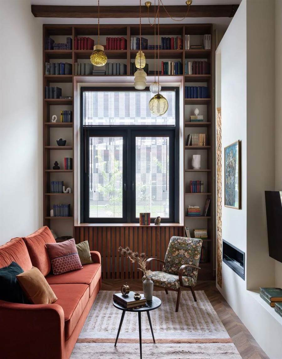 客廳的中央位置擺放著一把老式扶手椅和顧客家人收藏的書籍。水磨石下的咖啡桌是業主父親為數不多的記憶之一:一起收集了彩色鵝卵石和玻璃碎片。