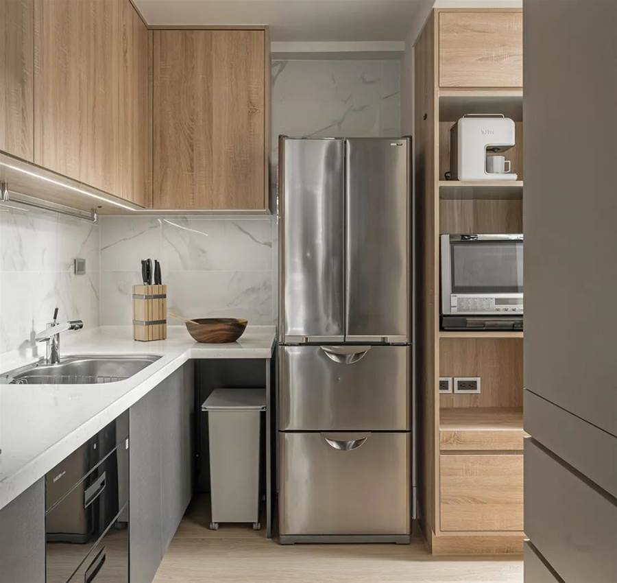 廚房方面,她采用了L型結構,并附帶了一個生活陽台。上下兩層的櫥柜顏色不一,搭配白色墻磚,顯得時尚整潔。