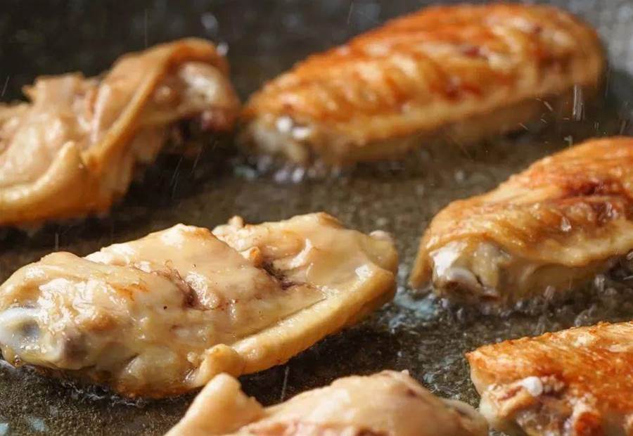熱鍋熱油,下雞翅煎至兩面金黃,加入1勺料酒、半勺老抽、半勺生抽翻炒至雞翅均勻上色。