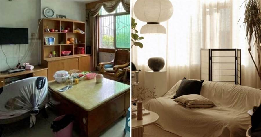 他家的房子,一看客廳就知道是過去刻意帶墻裙的那種,過去人們裝修客廳,或用木墻裙,或用瓷磚墻裙,最低也要刷上重色的墻漆做墻裙,給家平添了一道割裂感極強的腰線。特別有年代感的老舊硬木沙發,早已落伍,更需要全部換掉。