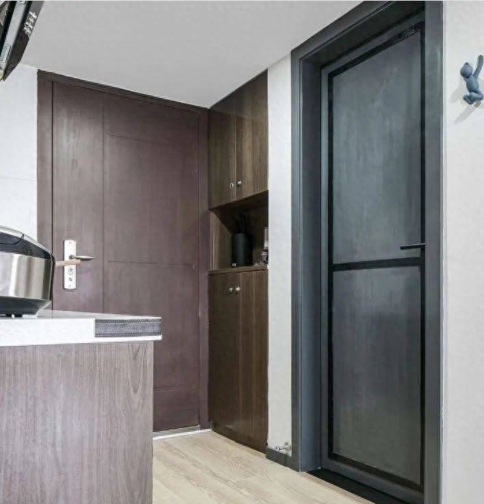 廚房位于公寓的右側,呈開放式設計,定制了一款黑胡桃木色的整體櫥柜,與鞋柜完美協調。
