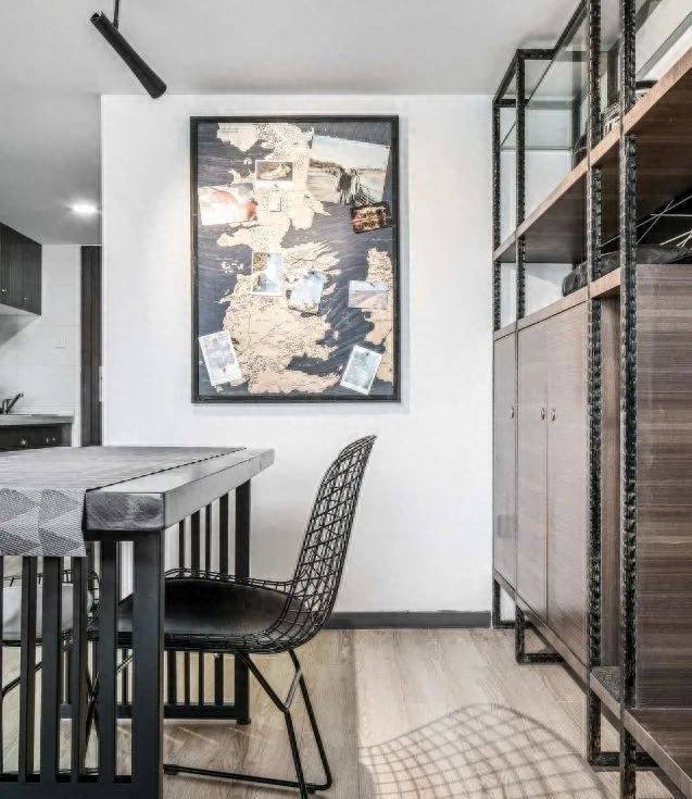 餐廳位于公寓的左側,與客廳相連。雖然沒有采用挑高設計,但餐廳上面裝飾了一幅裝飾畫,增加了一絲藝術氛圍。整個餐廳區域都定制了一排實木餐邊柜,上部還配備了玻璃擱架,不僅可以收納餐具,還可以展示一些擺件,實用又美觀。
