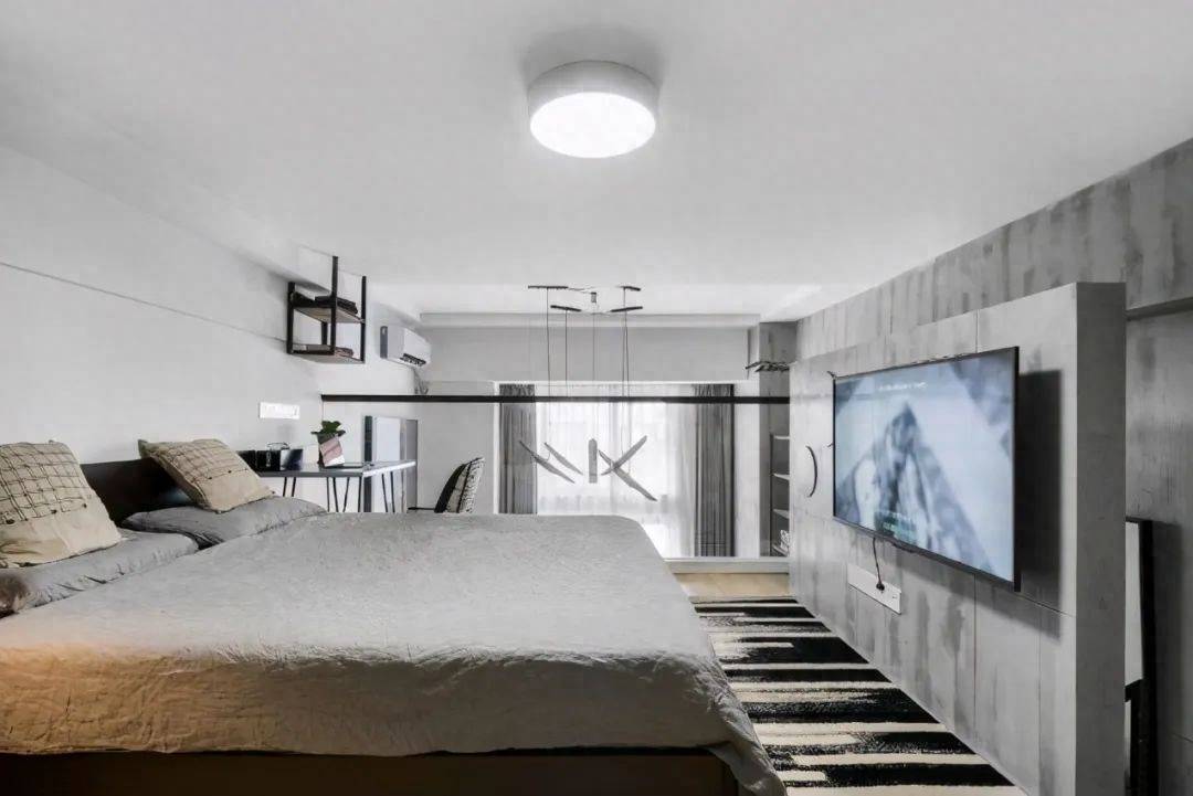 二層的臥室裝飾以灰白和原木色為主,床位于墻邊,給人一種舒適愉快的感覺。而床尾對面則安裝了一面電視隔斷墻,這樣躺在床上也可以同時欣賞電視節目。緊鄰床頭的玻璃護欄旁,規劃設有一個小型辦公區,墻壁上安裝了書架,還配備了一張精巧的辦公桌和一把透明小座椅,既實用又方便。