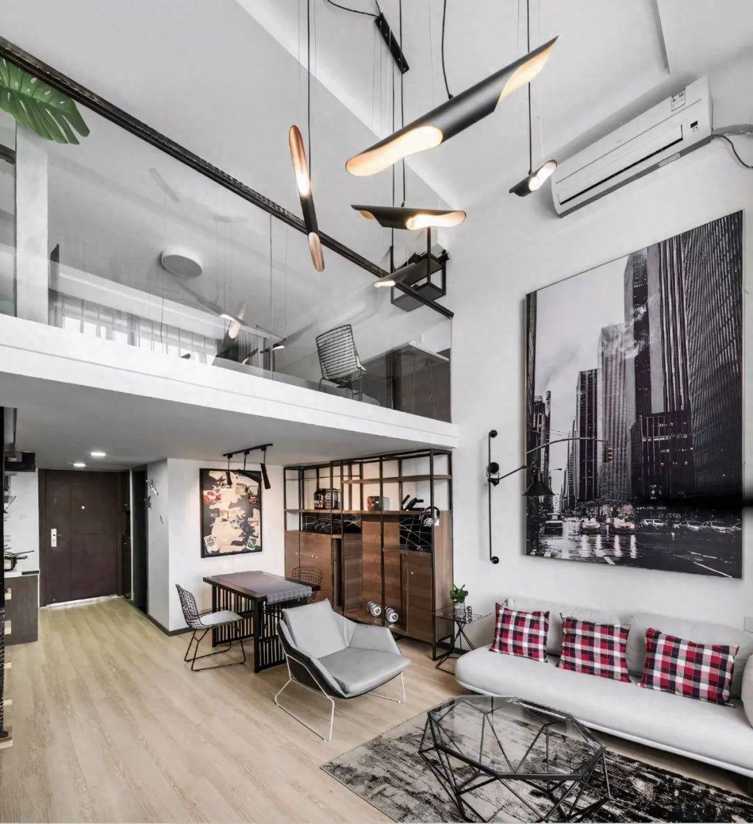 接下來我們來到客廳,這里是整個公寓的亮點。客廳保持了原來的挑高設計,非常引人注目。