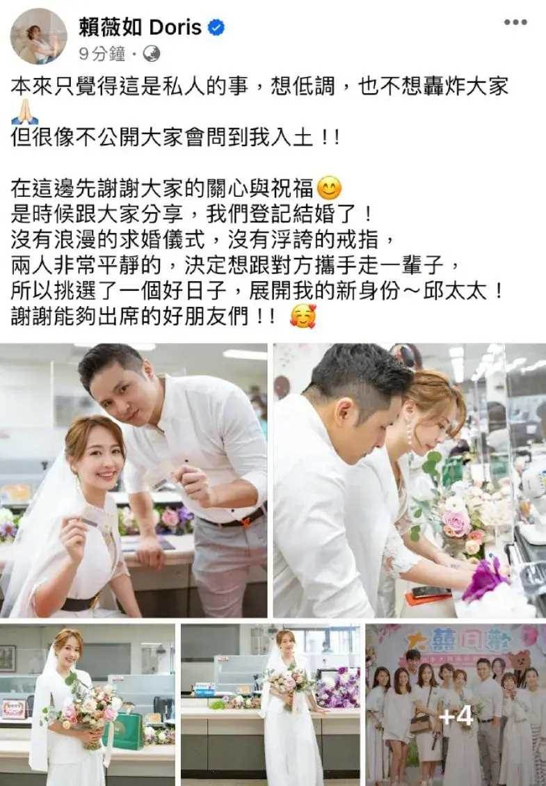 賴薇如在社交平台上她發文稱:「沒有浪漫的求婚儀式,沒有浮夸的戒指,兩人非常平靜的,決定想跟對方攜手走一輩子。」字里行間都透露出一股濃濃的幸福,祝他們新婚快樂!